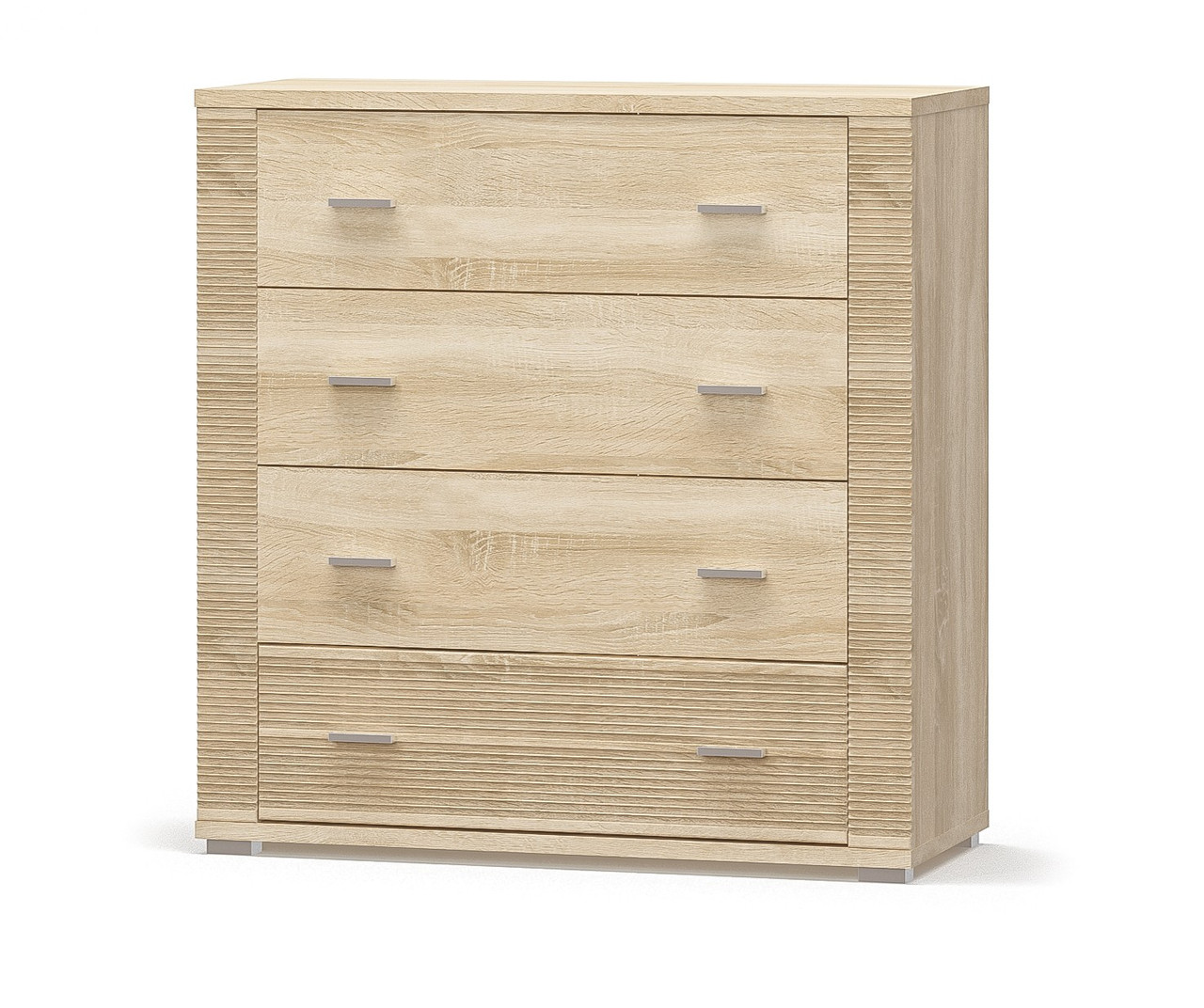Комод 4Ш системи "Гресс" від Мебель Сервіс оснащений чотирма висувними шухлядами. Така конструкція виробу дозволяє розмістити одяг, аксесуари або постільну білизну оптимальним чином.